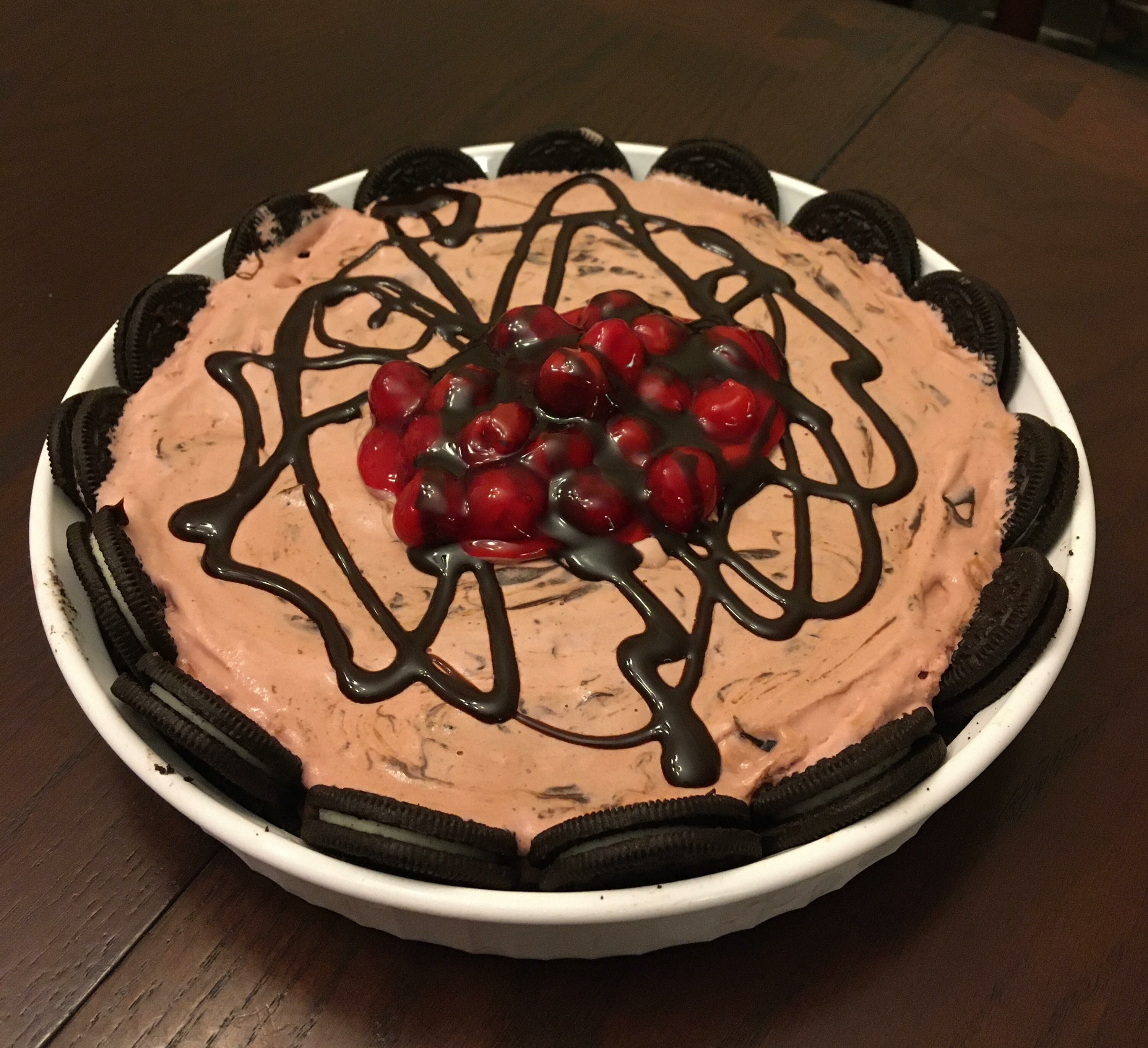 - 1/2 gallon dark cherry chocolate chunk ice cream, softened, divided
